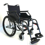 This self propelling wheelchair is a strong steel design with wide 45mm solid rear wheels and 7" front rubber tyres. Padded lift up arm rests and hard wearing nylon upholstery. Easy to operate swing away leg rests with manual brake on rear wheels.